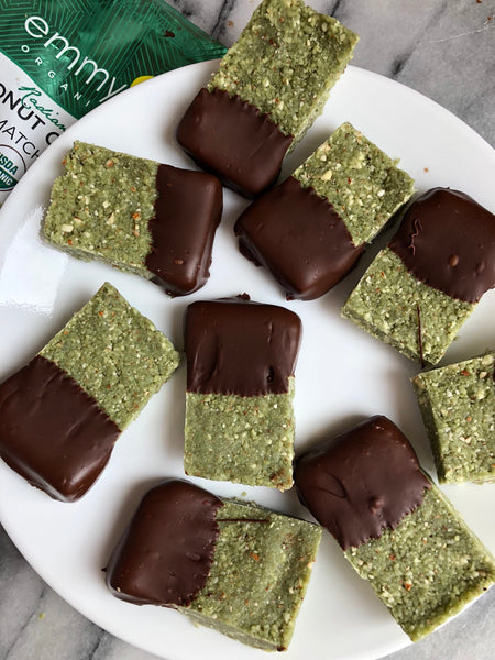 All ingredients are blended into a food processor, shaped, frozen and then dipped in chocolate.
