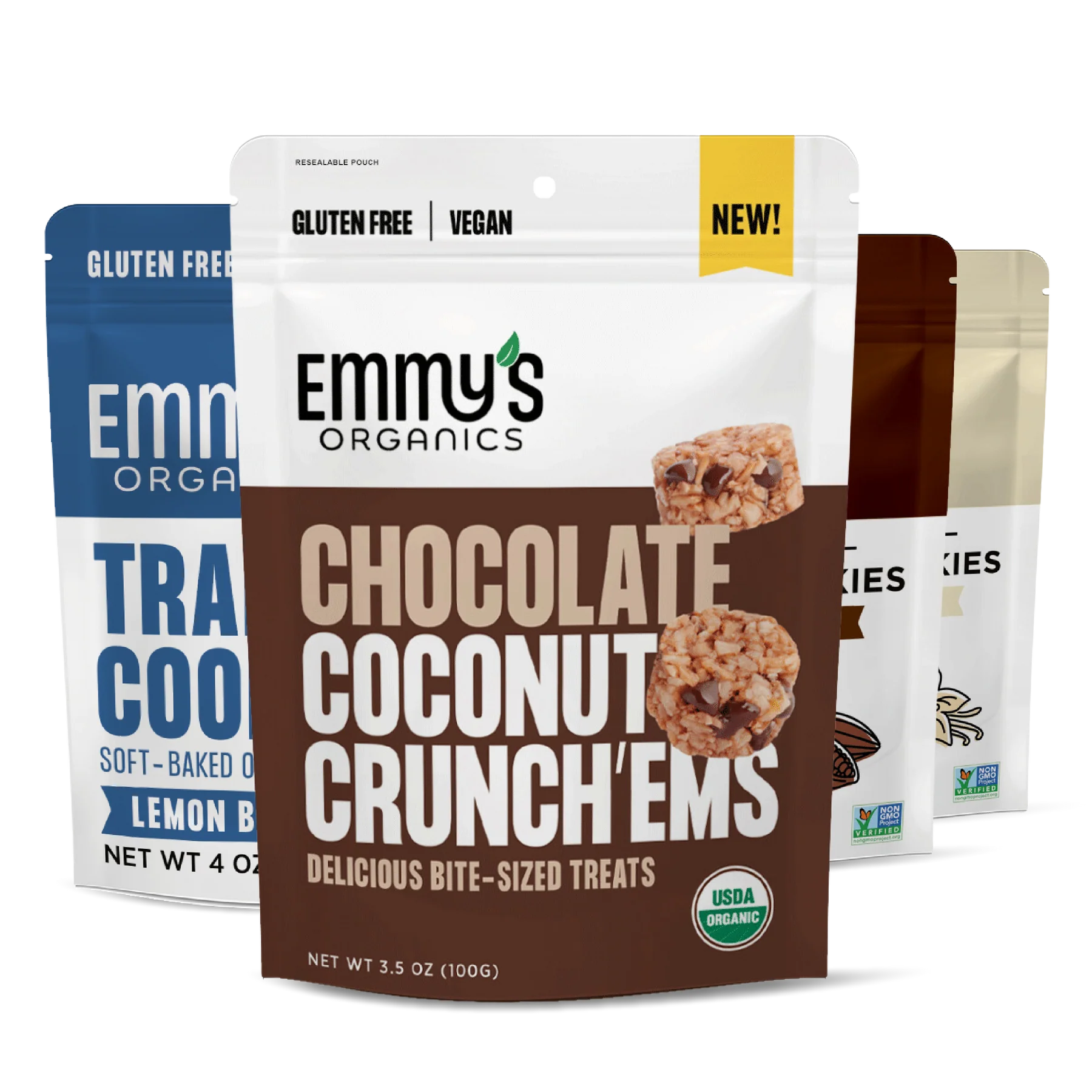 A great intro to Emmy's treats. Our top selling soft & chewy Coconut Cookies flavors and our new Coconut Crunch'Ems and Trail Cookies!